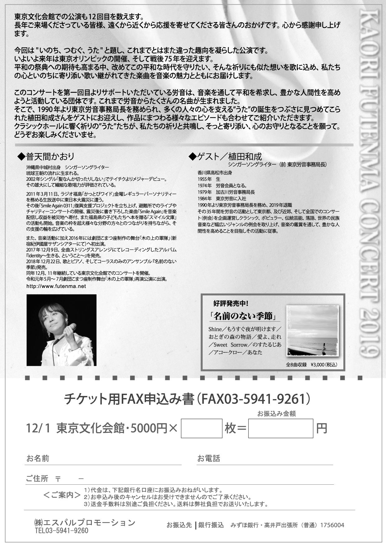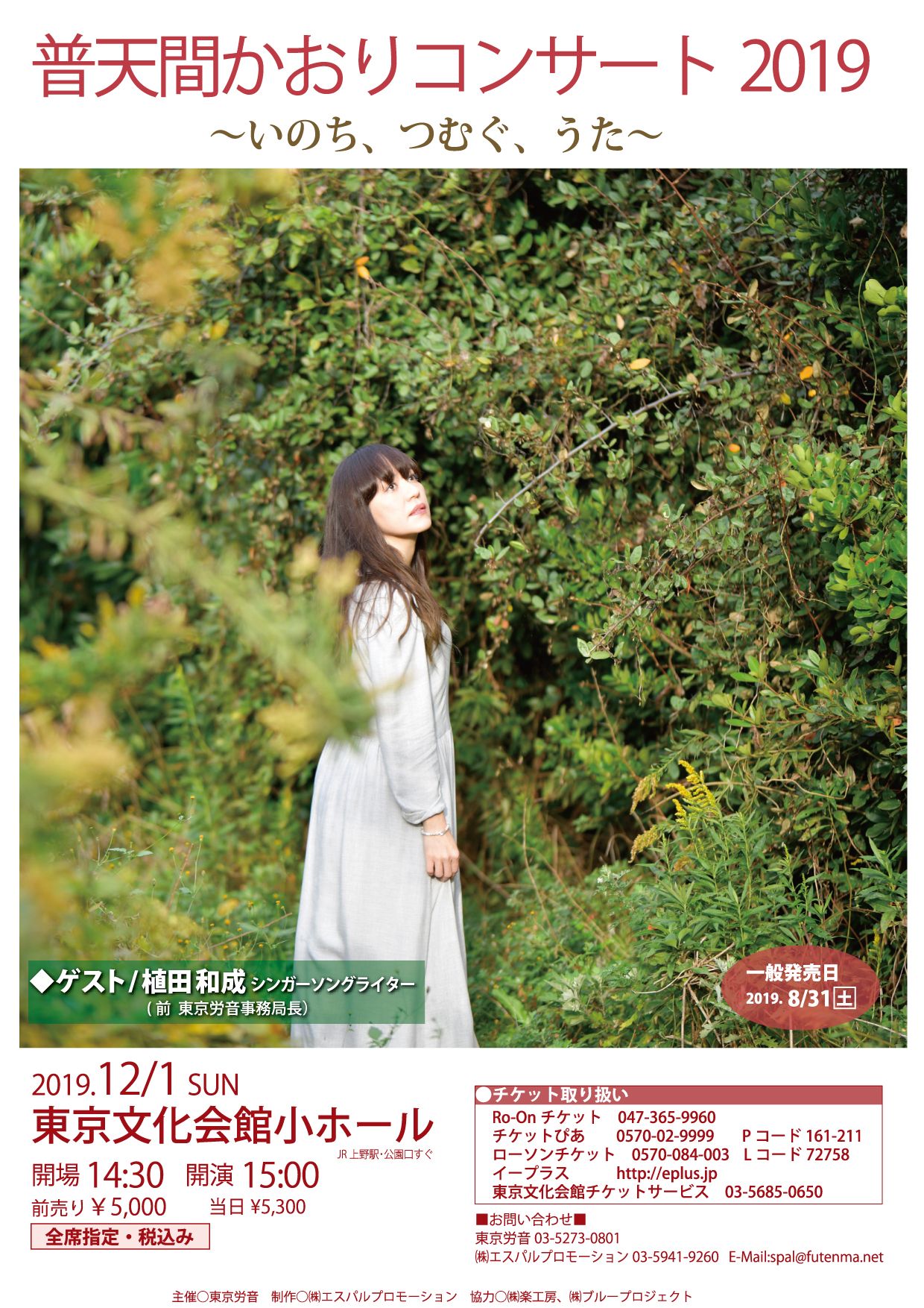 | 12月1日(日) 東京文化会館 普天間かおりコンサート2019 ~いのち、つむぐ、うた~ |